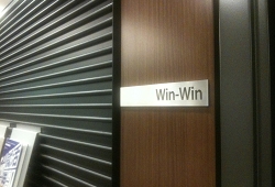 アルミのプレートをレーザーがカットし表面をヘアライン仕上げしたオフィスネームプレート