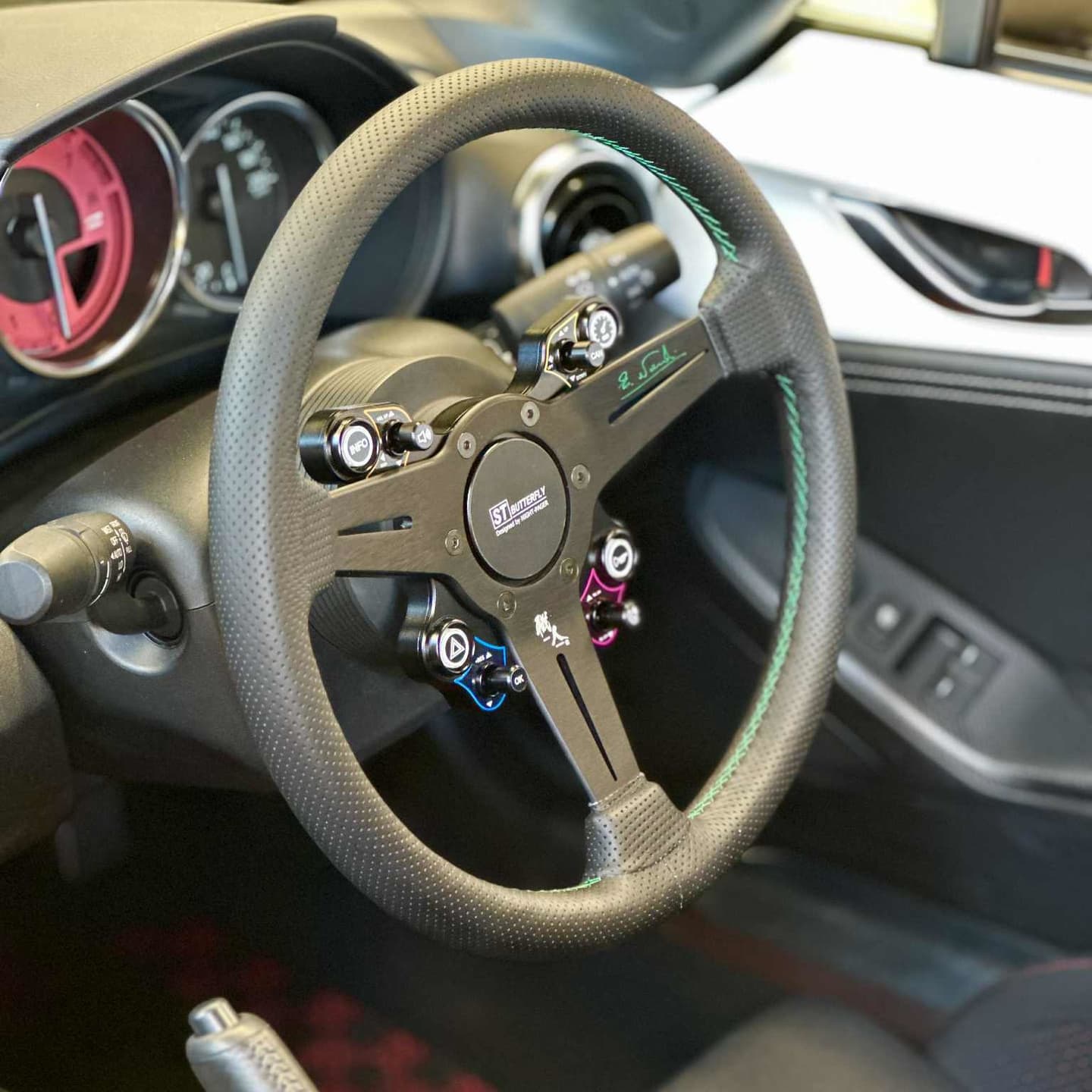 ■ステアリングを交換した際に失ってしまうステアリングスイッチ機能をスポーツ走行時に邪魔にならないよう小型のアルミニュウム削り出しケースに収めました。
